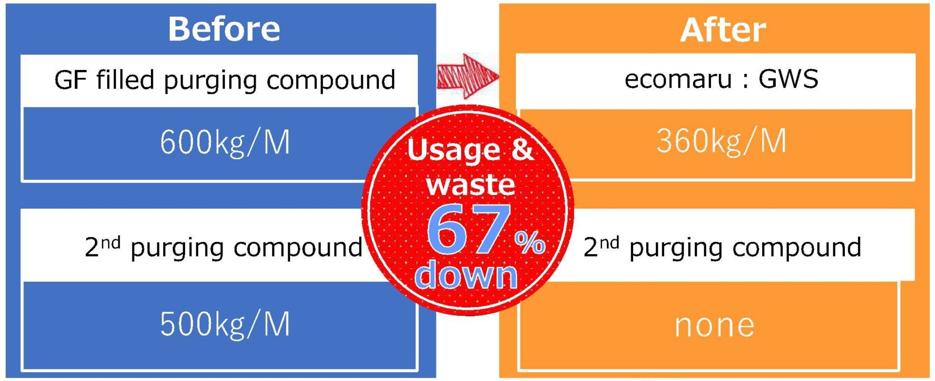 Conventional GF‑infused purging compounds typically recommend a two‑step purge using a discharge grade. In contrast, ecomaru’s superior dischargeability allows changeover to be completed by simply flushing with the subsequent resin, so a second purge is generally unnecessary. This substantially reduces labor and cost.