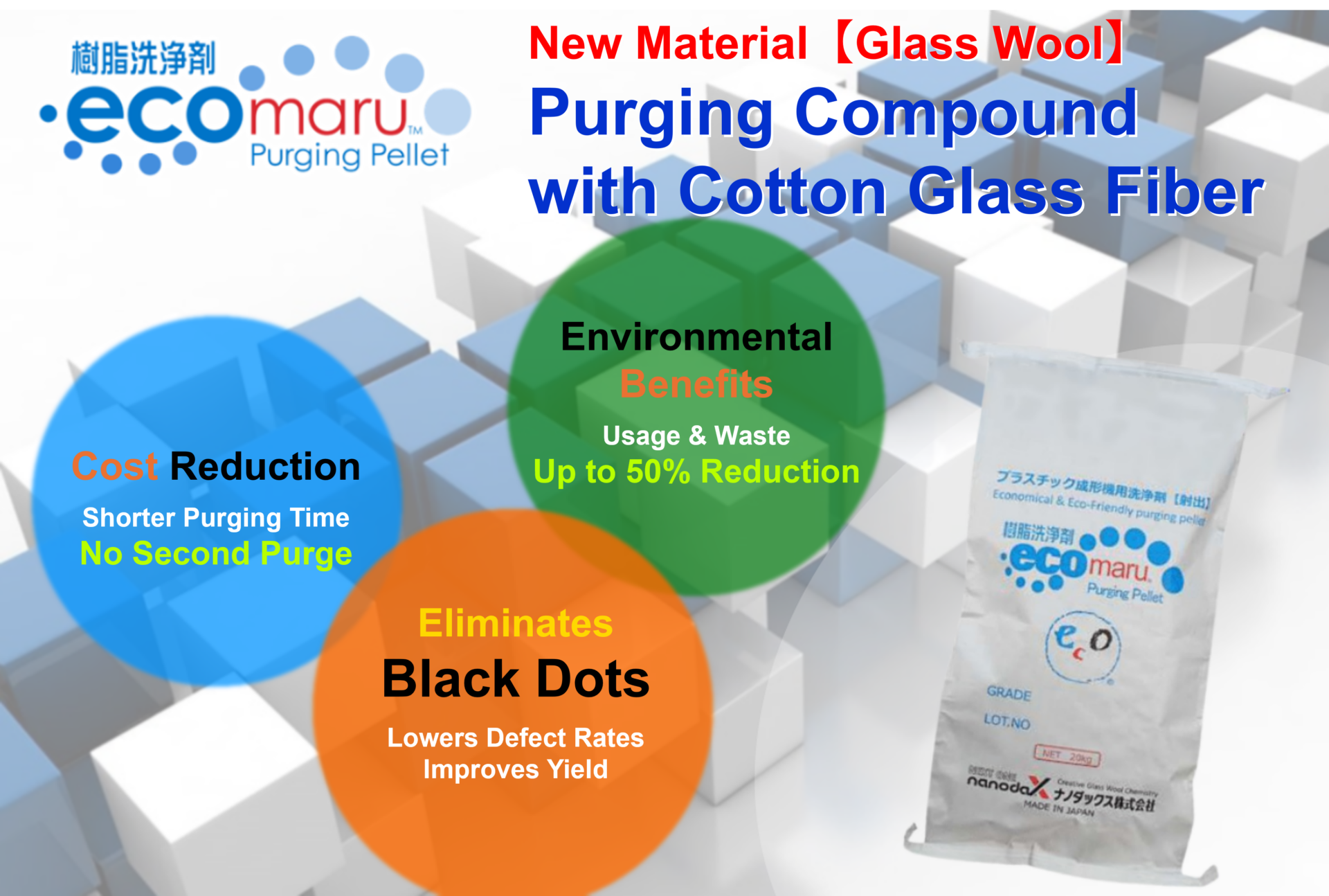 ecomaru is the world’s first purging compound for plastic molding machines containing glass wool. Compared with conventional purging compounds containing glass fiber, it provides higher cleaning performance.