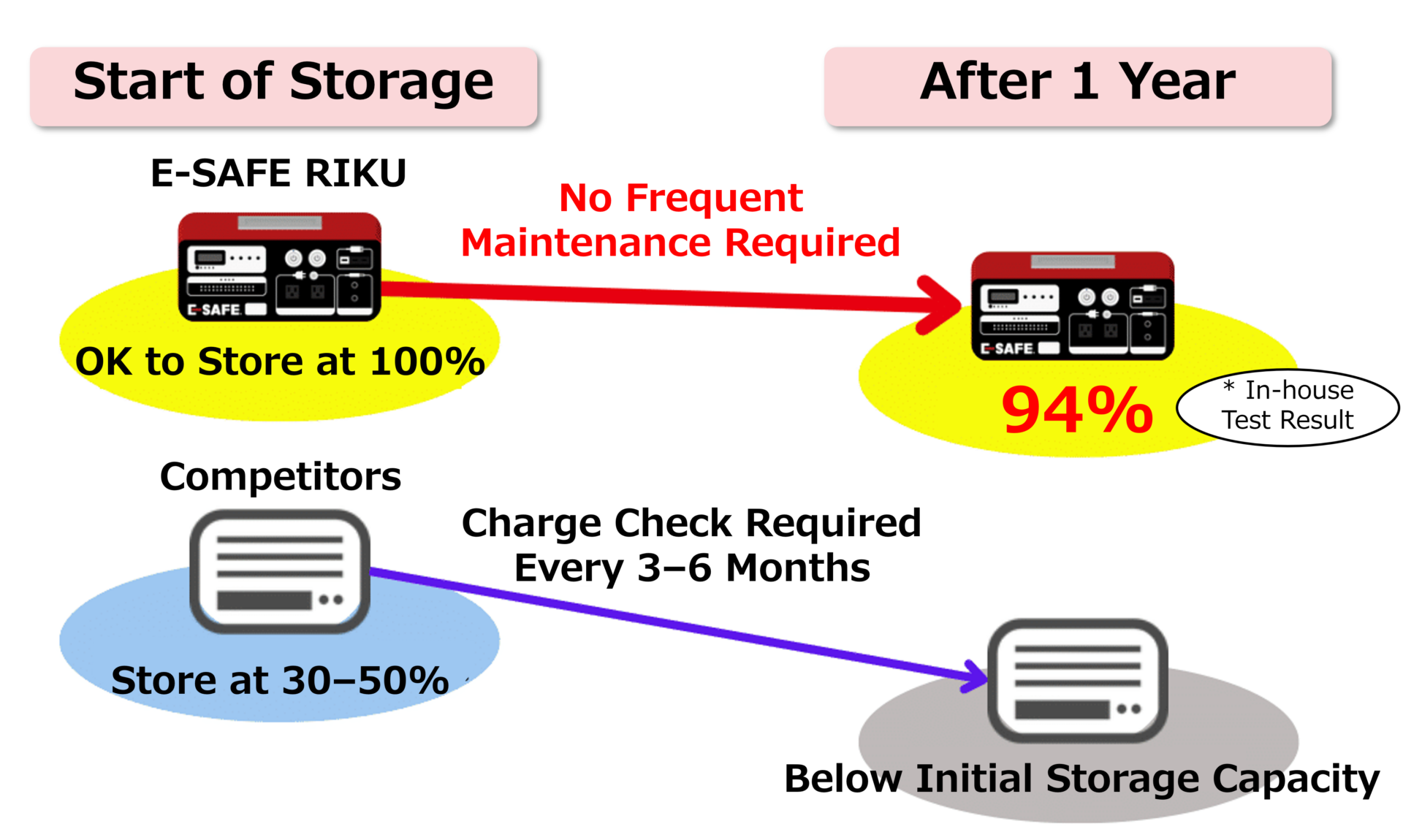 Usable even after one year of storage without recharging. Unlike conventional storage batteries, frequent maintenance such as charge checks is unnecessary.
